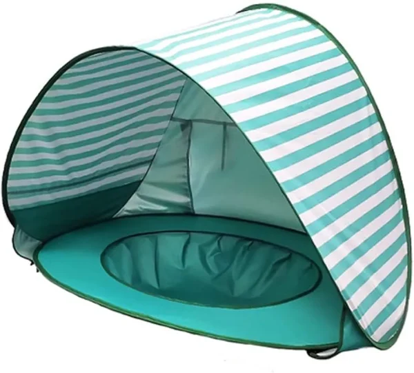 Mini Piscina Integrada: El centro del suelo tiene un área especial que puede llenarse con una pequeña cantidad de agua, creando una divertida y segura mini piscina para que el bebé chapotee y se refresque bajo la sombra.