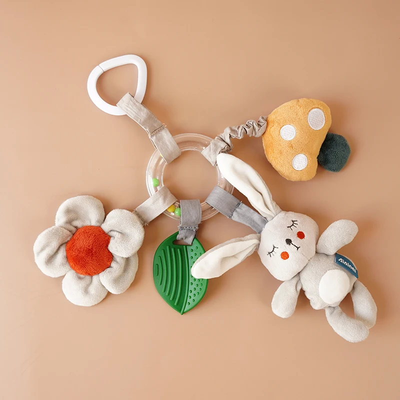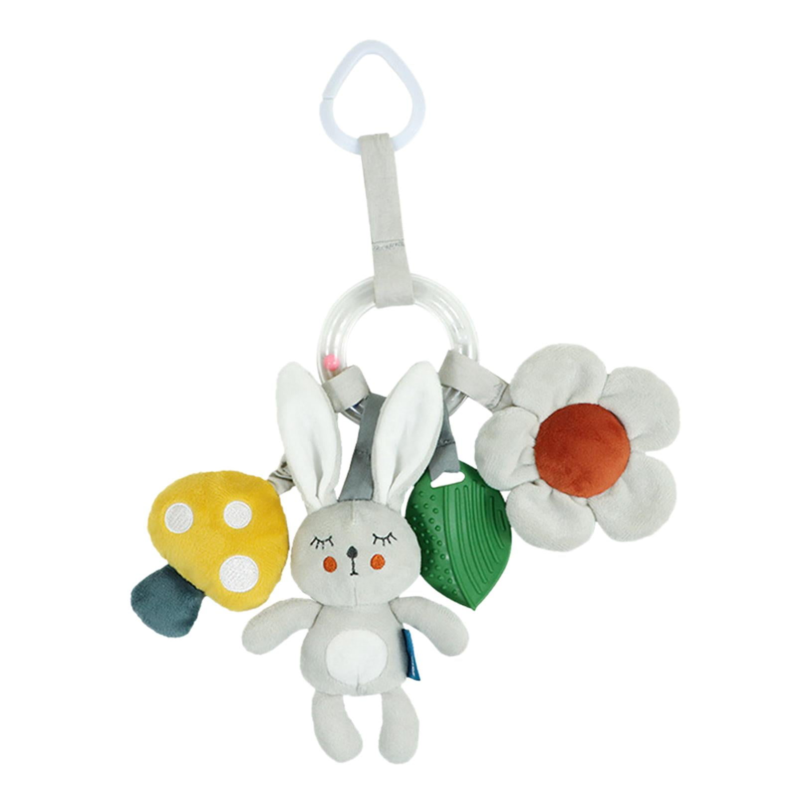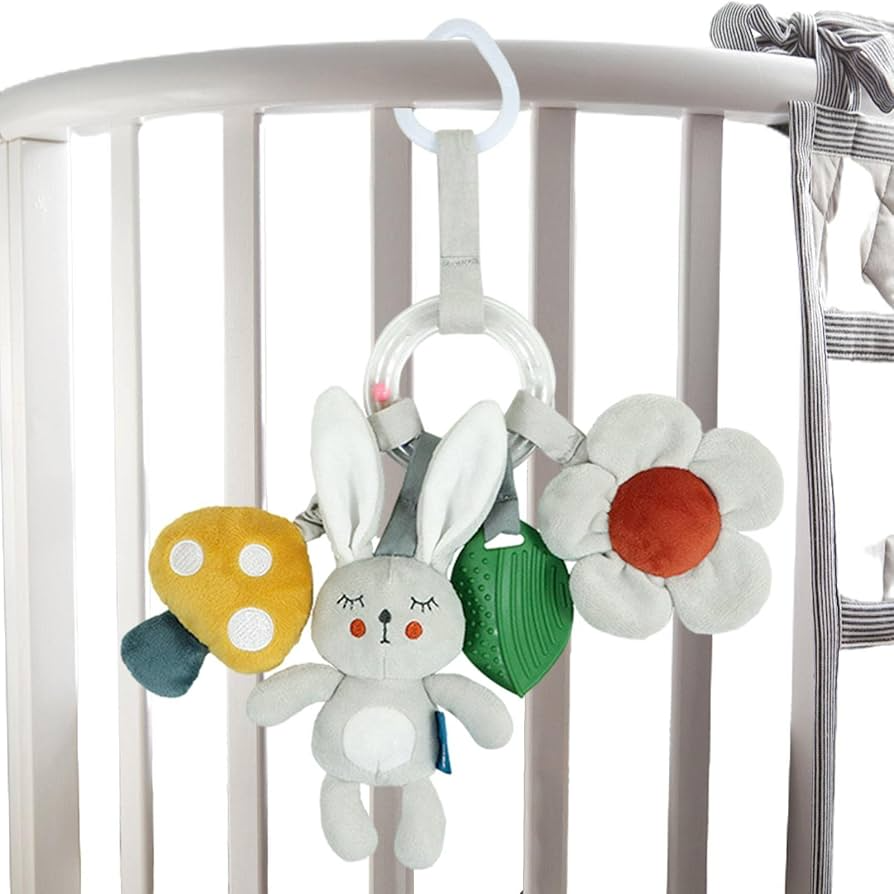 Pieza central con sonido tipo campanitas y tres objetos colgantes para apretar. Modelo de conejo junto a otros tiernos colgantes y una hoja en silicona.